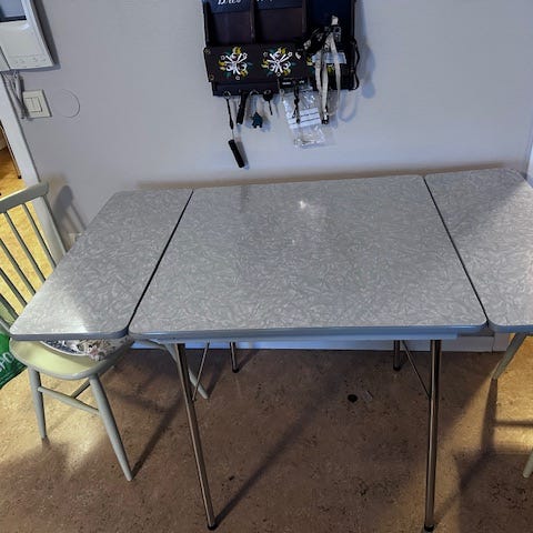 Fire Respatex bord, bredde 80 cm dybde 68 cm. Bordene har lemmer på hver side som kan dras ut. Lemmene er 22 cm brede.