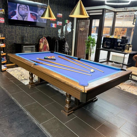 biljardbord i størrelse for innendørs bruk med grønt bordduk og seks biljardkøller. Bordet har en solid konstruksjon med svarte ben og ramme. Passer for biljardspill i private eller offentlige miljøer. Må hentes og eventuelt demoneres av kjøper.