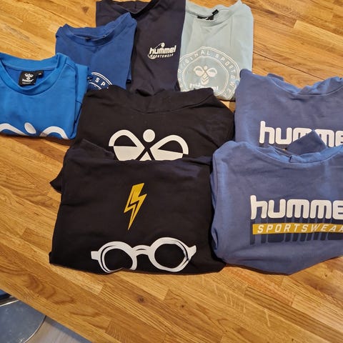 Selger klær fra Hummel. De er pent brukt, ser ikke bruksmerker på dem. Joggebukse og hettegenser i mørkeblå og mellomblå er i strl 116. T-skjorte, grønn i strl 110.