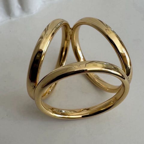 Skjerfring i gull. Passer best til silkeskjerf 65x65cm eller større. Skjerfringen er i metall. Den er pent laget, og ser eksklusiv ut. Passer spesielt godt til silkeskjerf. Kan brukes på andre skjerf også, bare skjerfet ikke er for tykt for hullet i skjerfringen. Åpningen inni ringen er er 20 mm. Ytterkant 30mm. Den er ikke tung slik at den sklir på skjerfet. Har denne i sølv også.