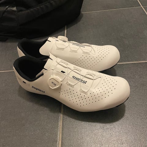 EKOI Perf R4 LIGHT CARBON INSERT sykkelsko i størrelse 44. Skoene er hvite og utstyrt med BOA-lukkesystem for justerbar passform. Designet for sykling med karboninnlegg for økt stivhet og ytelse.