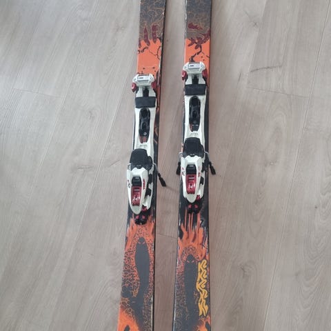 K2 Shreditor 75 alpinski med bindinger. Skiene har et fargerikt design i svart, oransje og gult. Passer for allsidig bruk i bakken.