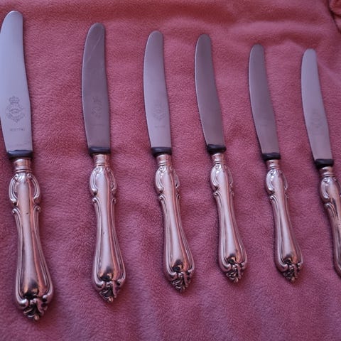 Selger 6 fruktkniver - antagelig sølvplett - samlet, for 150 kroner + frakt.