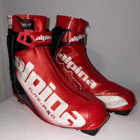 Alpina Duathlon JR skisko i størrelse 35. Skiskoene har en svart og rød fargekombinasjon og er designet for juniorbruk. De har en robust konstruksjon med feste for skibindinger, egnet for langrenn og duatlon.