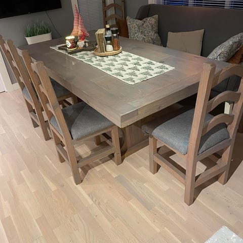Ganske solid spisebord fra eureka møbler, kjøpt i 2022 og gjort jobben sin. Er veldig synlig slitt i bordplaten.(kan sikkert fikses) Siste bildet er da det var nytt. Målene kan jeg ikke ta, da bordet er beina er skrudd fra. Må hentes