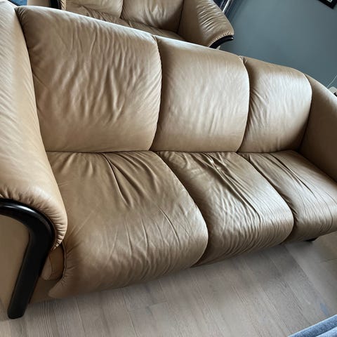 Godt brukt 2 og 3 seter skinnsofa med puff gies bort.