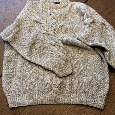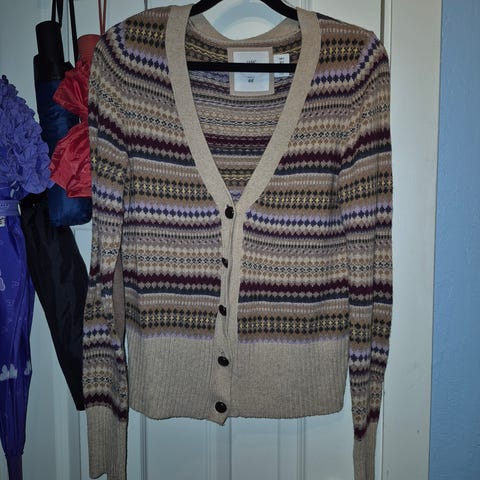Original genser fra H&M L.O.G.G.-serien, kolleksjon 2011–2012. Laget i en varm og myk blanding: 42% ull, 30% akryl, 28% alpakka. Klassisk brun design med tykk tekstur, rund hals med ribbestrikk og knappestolpe med fem knapper foran. Str. S. Brukt én gang eller nesten aldri. Svært god stand uten flekker eller skader. Originale merkelapper er bevart.