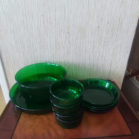 Et stort serveringsfat i designet "Sierra" fra Arcoroc i ravfarget pressglass. Frankrike, 1960-1970-tall.