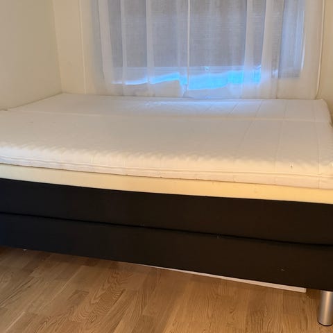 Sengen er godt brukt, og madrassen har tydelig bruksslitasje.