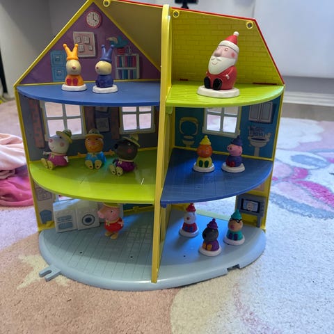 Pent brukt Peppa Gris lekehus med figurer og møbler.