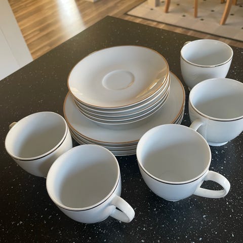 Porsche Orchi kopp og skål sett i porselen. Settet inkluderer kopper med tilhørende skåler, designet for bruk til servering av drikke. Produktet har en lys farge med dekorative detaljer.