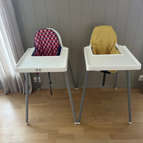 Barnestol fra ikea selges for 100 kr. Må hentes. Med pute, brett og belte.