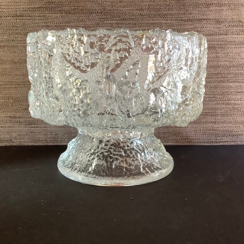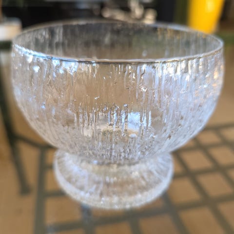 Iittala glassfat med dekorativt boblemønster. Fatet er laget av klart glass og har en rund form med tekstur som gir et unikt utseende. Egnet for servering eller som dekorativt element.