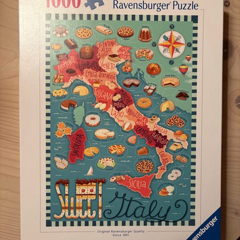 Ravensburger Italia puslespill med 1000 biter. Puslespillet har dimensjoner på ca. 50 x 70 cm og viser et illustrert kart over Italia med ulike matvarer og steder. Materialet er standard puslespillmateriale.