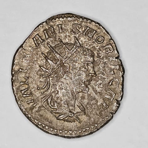 Septimus Severus Billon mynt fra perioden 193 til 211 e.Kr. Mynten er laget av billon, en legering med lavt sølvinnhold, og er plassert i en svart oppbevaringsboks.