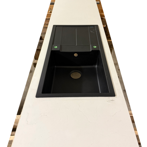 Benkeplate i stein med integrert vask. Passer til f.eks. kjøkkenøy for ekstra arbeids- og oppbevaringsplass eller utekjøkkenet.