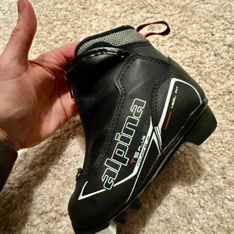 Alpina skisko i svart og sølv farge. Designet for å gi støtte og komfort ved bruk. Inkluderer snøring og glidelås for enkel tilpasning.