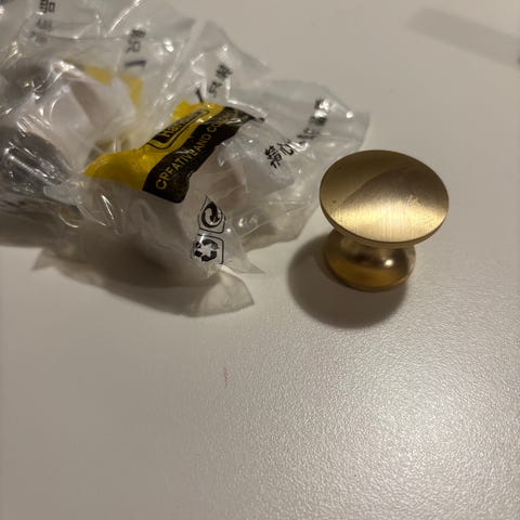 Messing håndtak med en lengde på 12 cm. Håndtaket har en glatt overflate og rundede kanter, egnet for montering på møbler eller skap.