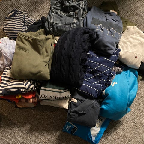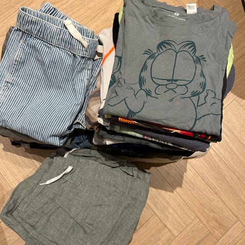 Inneholder ulike plagg som gensere, t-skjorter, skjorter og bukser i forskjellige materialer og farger. Se beskrivelse av plaggene i undertekst på hvert bilde.