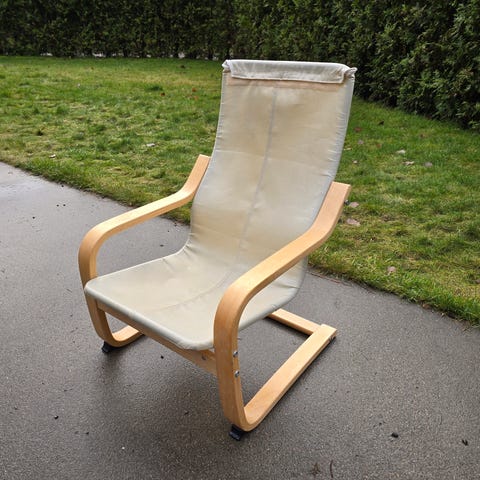 Praktisk stol med avtagbart bord. Både fotstøtte og høyden på stolen kan justeres.