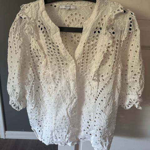 Småblomstret bluse i plissert kvalitet med struktur og pufferm med høy elastikk, volangkant og smal dekorbånd. Blusen har elastisk bærestykke bak, rund hals med trukne knapper i front. Ledig passform.