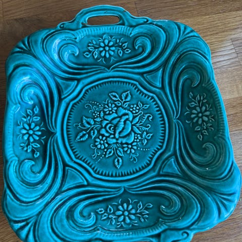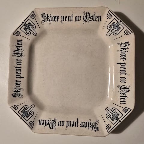 Et dekorativt ostefat i Jugendstil fra Sarreguemines, Frankrike. Tidlig 1900-tall.