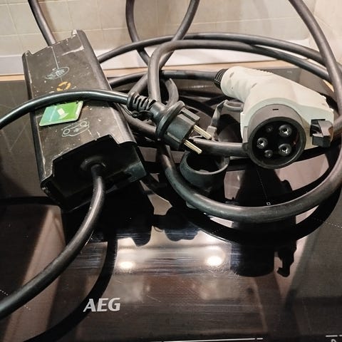 Inferno Mode 2 EV-lader med tilkoblingskabel for lading av elektriske kjøretøy med kontakt Type 1. Det er CEE støpsel på ladeboksen. Trykknapp på boksen kan skifte fra 10A til 16 A før tilkobling til bilen.