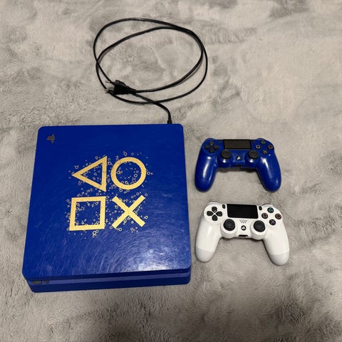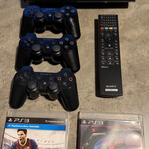 Sony PlayStation 3 spillkonsoll i svart farge. Følger med ledninger, en kontroll og fifa 14.