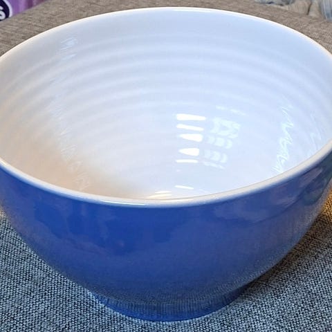 Figgjo porselen skål med blå innside og hvit utside.