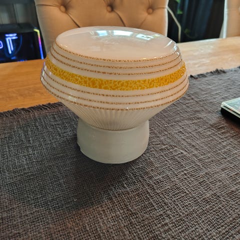 Kobberfinish, hele og dekorative glass prismer og tak kopp med opphengskrok av den solide, gamle typen.