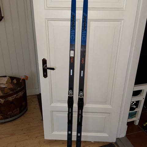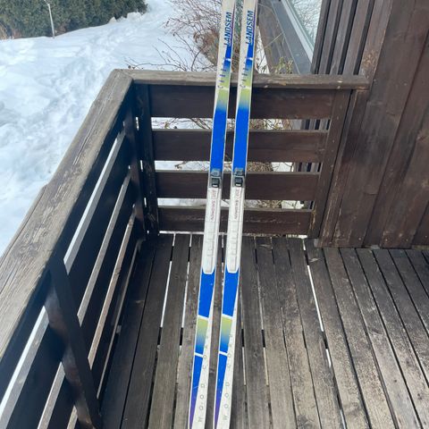 Landsem 177 langrennsski i blå og rød farge. Skiene har NNN bindinger montert.