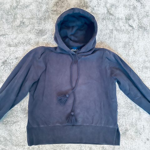 ella&il hettegenser i merinoull, størrelse L (føles som M), farge grønn. Genseren er designet for kvinner og har hette med snorer. Laget av merinoull som gir varme og komfort. Bukse som hører til. Str M.