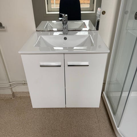 Servantskap med integrert servant og krom Mora blandebatteri. Servantskapet har en skuff for oppbevaring og er hvitt i farge. Egnet for baderom.
