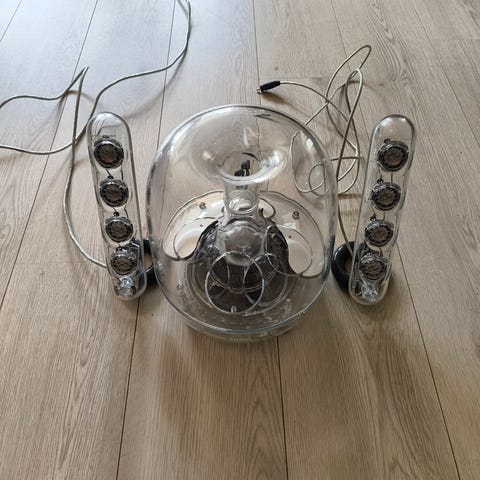 Harman Kardon SoundSticks høyttalersystem med transparent design. Systemet inkluderer en subwoofer og satellitthøyttalere. Kabler og strømadapter følger med.