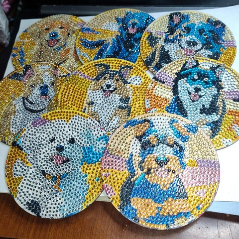 Selger et sett med 4 stk 3D-printede drikkebrikker med tilhørende holder, laget i solid materiale.