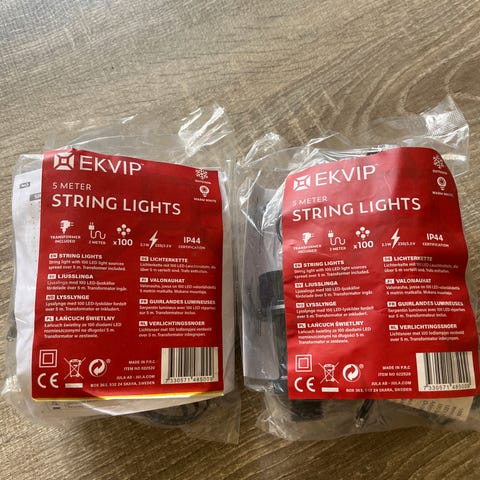 Selger en fin lyslenke fra Jysk da den ikke brukes. Fra stikkontakt til første lys er det ca. 3m med ledning, og selve lenken er ca. 3m den også. Hel og fin.