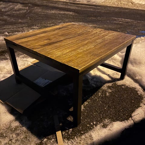 VINTAGE sofabord brun resirkulert alm 80x80 lakkert svart metall understell.