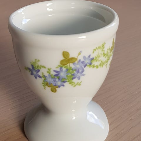 Gul keramikk and figur med sløyfe og et glass med påskedekor i gult og oransje. Passer til dekorasjon eller påsketema.