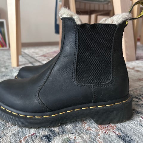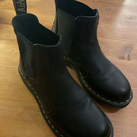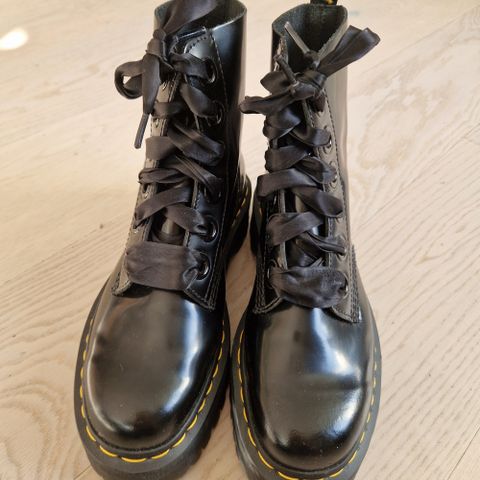 Dr. Martens Andre sko i størrelse 38, svart farge. Skoene har en tykk såle med mønster for grep, og er laget i skinnmateriale. Designet for generell bruk.