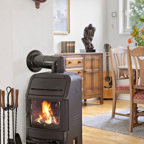 Sort metallbeholder med rund form og to håndtak på sidene. Egnet for oppbevaring av ved eller dekorative formål.