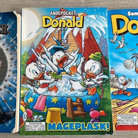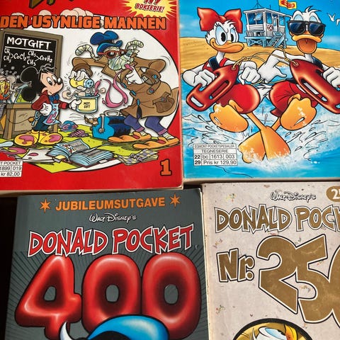 Selgen en haug med Donald pocketbøker.