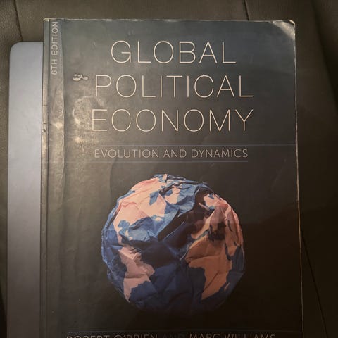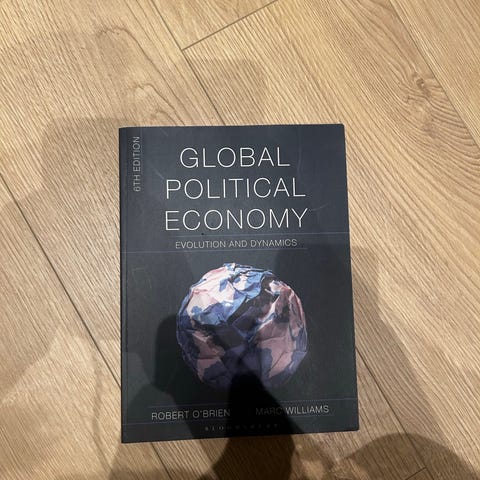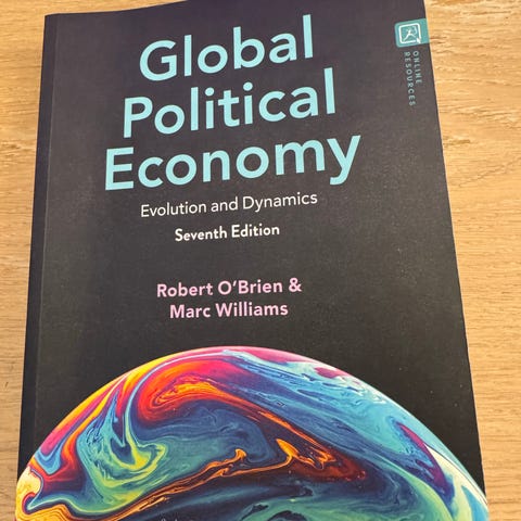 Robert O'Brien Global Political Economy lærebok med fokus på økonomi og administrasjon. Boken dekker temaer innen global økonomi og politiske dynamikker.