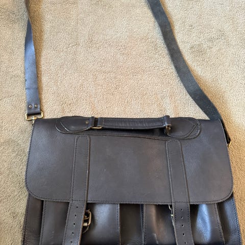 Solid skulderveske i lær selges. Håndsydd og romslig. Knapt brukt, så ingen feil eller mangler. Sender gjerne.
