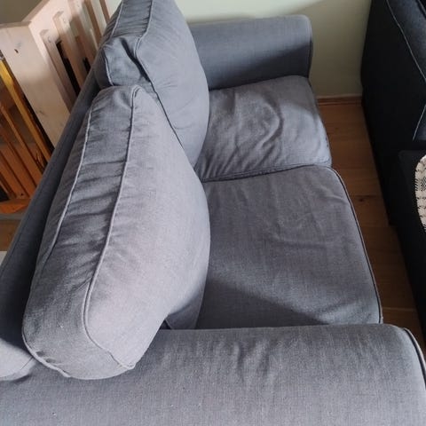 Sofa med sjeselong selges da den bare står å tar plass! Puter kan vendes, og trekk kan tas av og vaskes. Sjeselongen kan stå på begge sider av sofaen. En skade på sjeselongputen, men den er ikke synlig.