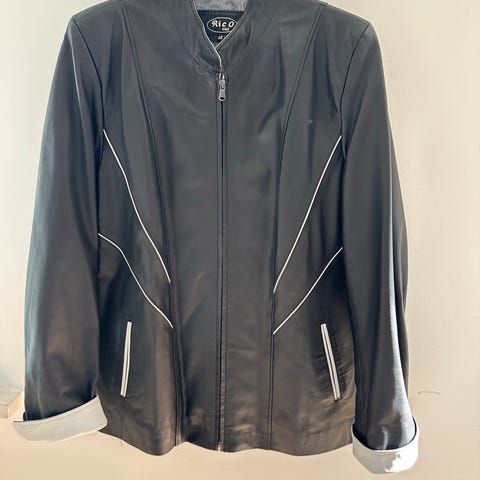 Skinnjakke i størrelse XL for dame fra Yepalin, tilsvarer mer en størrelse M. Jakken er sort og laget av skinn. Den har knappelukking og flere lommer foran. Jakken har detaljer i hvit kontrastsøm og belte i livet.