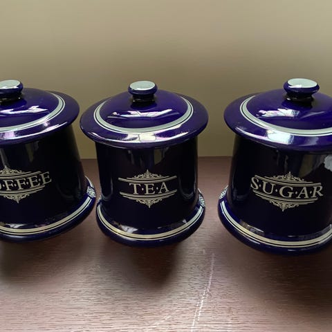 Kaffe-/te-/ og sukkerkrukke med lokk og gummiring, mugge og morter, selges samlet. Mørk blå fajanse/stentøy i meget god kvalitet. Produsert i England. Kr 200,- pr del, ferdig prutet!