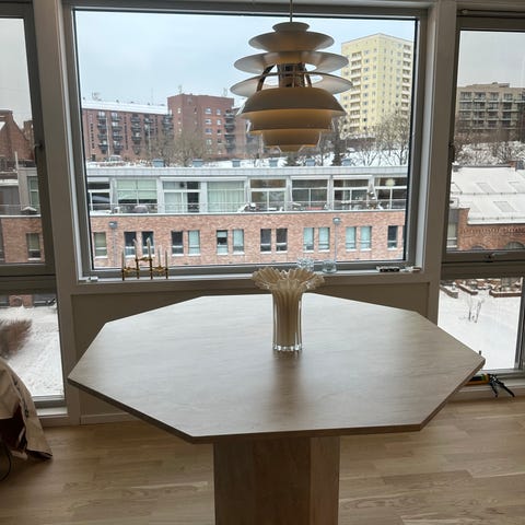 Jysk Marstrand bord selges rimelig. Bordplaten har noen få bruksmerker, og det er også et merke i tilleggsplaten. Uten om dette er bordet i god stand!