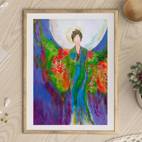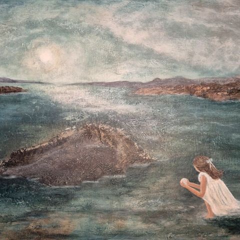 Fargerikt kunstverk med landskap og foss | kom med bud