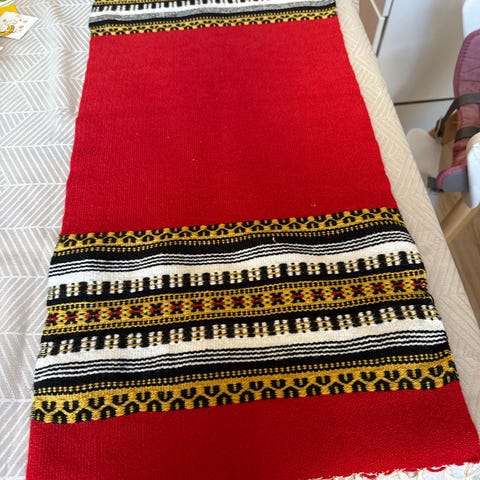 Bredde 1.30 m og lengde 1.74 m . Usikker på stoff type på duken men litt grovt .