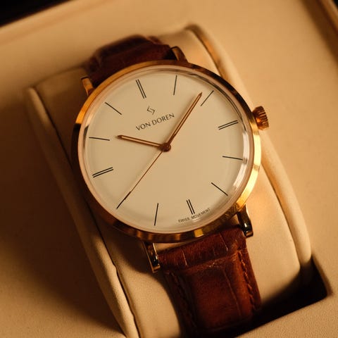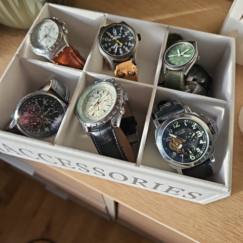 Stålkasse på 41 mm, kronograf og datovisning, safirglass, vanntetthet på ca. 30 m.